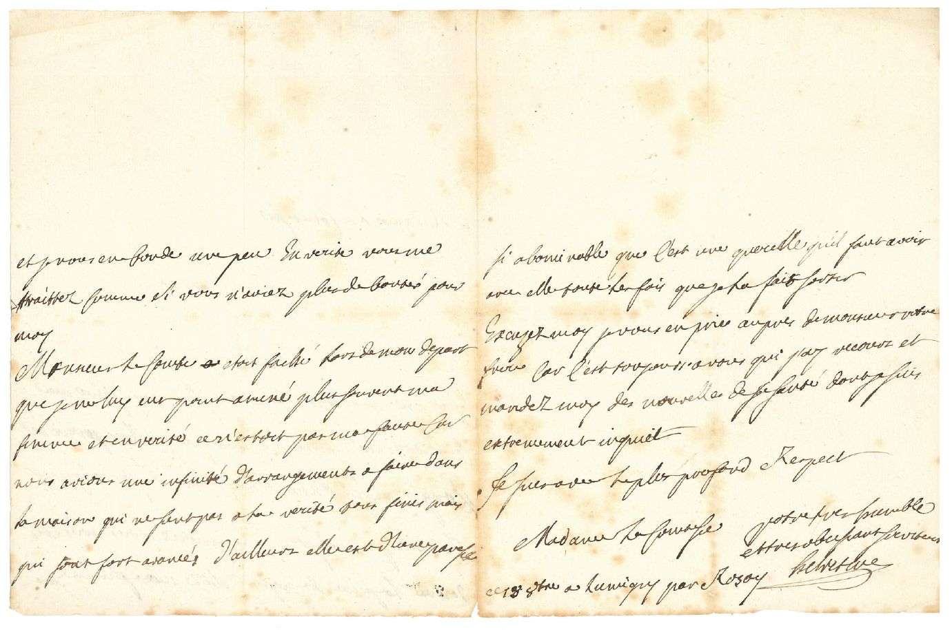 Je scais que malgrez ma priere vous vous etes donné la peine de passer chez ma femme et je vous en boude un peu. En verite vous me traittez comme si vous n'aviez plus de bonté pour moy. Monsieur le Comte etoit faché lors de mon depart que je ne luy eut point amené plus souvent ma femme et en verité ce n'estoit pas ma faute car nous avions une infinité d'arrangements a faire dans la maison [...]. D'ailleurs elle est d'une paresse si abominable que c'est une querelle qu'il faut avoir avec elle toutes les fois que je la fais sortir. Excusez-moy je vous en prie aupres de monsieur votre frere car c'est toujours a vous que j'ay recours et mandez moy des nouvelles de sa santé dont je suis extremement inquiet»