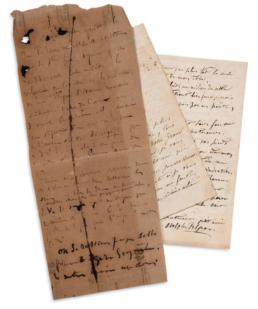 On joint une L.A.S. d'Adolphe PELLEPORT à Juliette Drouet, Jersey 10 juillet 1864 (6 p. in-12) : «Vous qu'a chantée le plus grand poète du monde, vous qui avez les vers de votre grand ami, veuillez excuser, je vous en supplie, votre petit ami qui ose vous envoyer ses jeunes rimes.