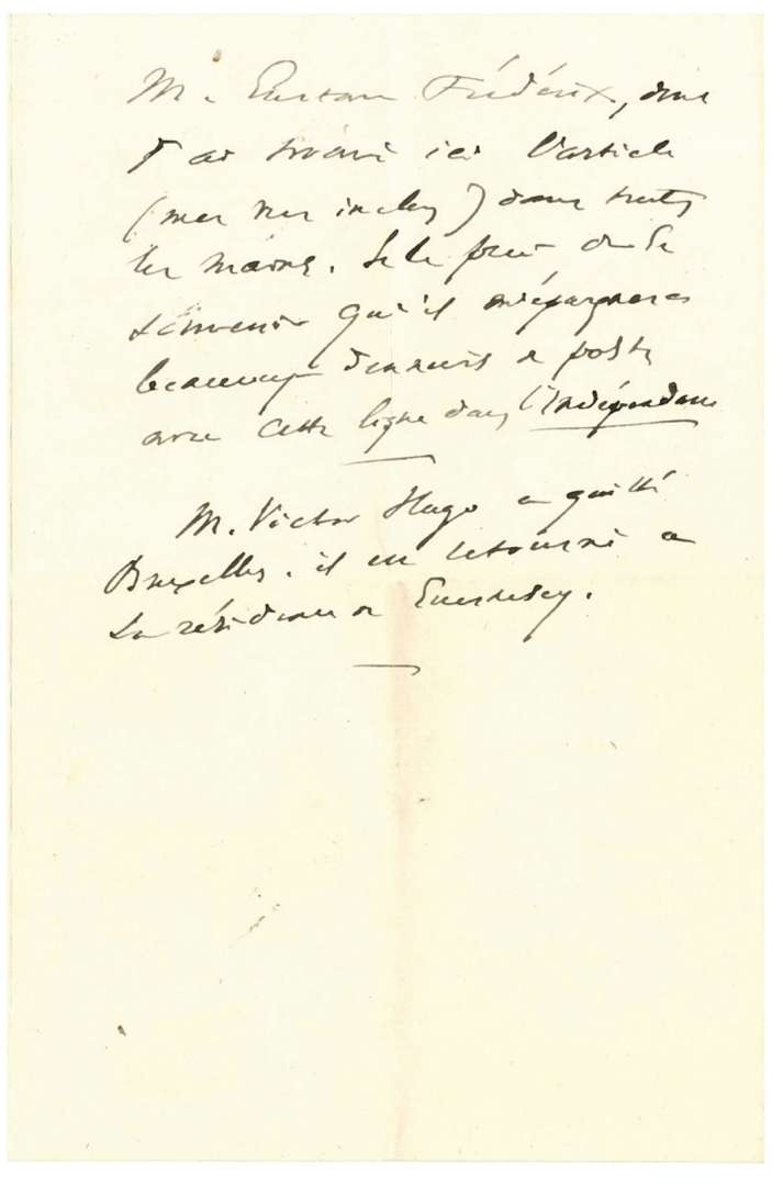 N'oubliez pas de m'envoyer à Guernesey le plus de ces journaux que vous pourrez. Serrement de main ex imo à M. Gustave Frédérix, [...] il m'épargnera beaucoup d'ennuis de poste avec cette ligne dans l'Indépendance - M. Victor Hugo a quitté Bruxelles. Il est retourné à sa résidence de Guernesey»...