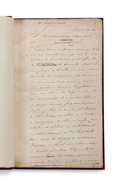Londres, 23 septembre 1850, Bradel, percaline rouge, dos lisse, titre noir en long, étui, reliure postérieure. 75 pages: 39 pp. in-folio sur papier vergé filigrané numérotées 1 à 8 et 30 à 59, 22 pages in-folio sur papier vergé teinté bleu, numérotées 9 à 29 et 14 pages sur papier ordinaire.