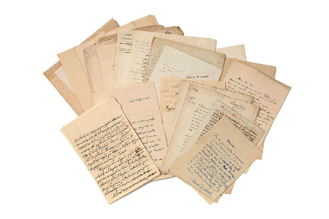 Jano), Jules RENARD (2), George RODENBACH, Edmond ROSTAND (2, ses travaux en retard ne lui permettent pas de s'occuper d'un poème à mettre en musique | «après la victoire de la France c'est-à-dire de la Fraternité, je causerai plus volontiers avec vous de la fraternité des Peuples»...), Bernardin de SAINT-PIERRE (à sa femme), Charles SAINTE-BEUVE (ms d'une dissertation à la pension Landry sur Philippe le Bel, et l.s. à un docteur 1869), Eugène SCRIBE (à son collaborateur