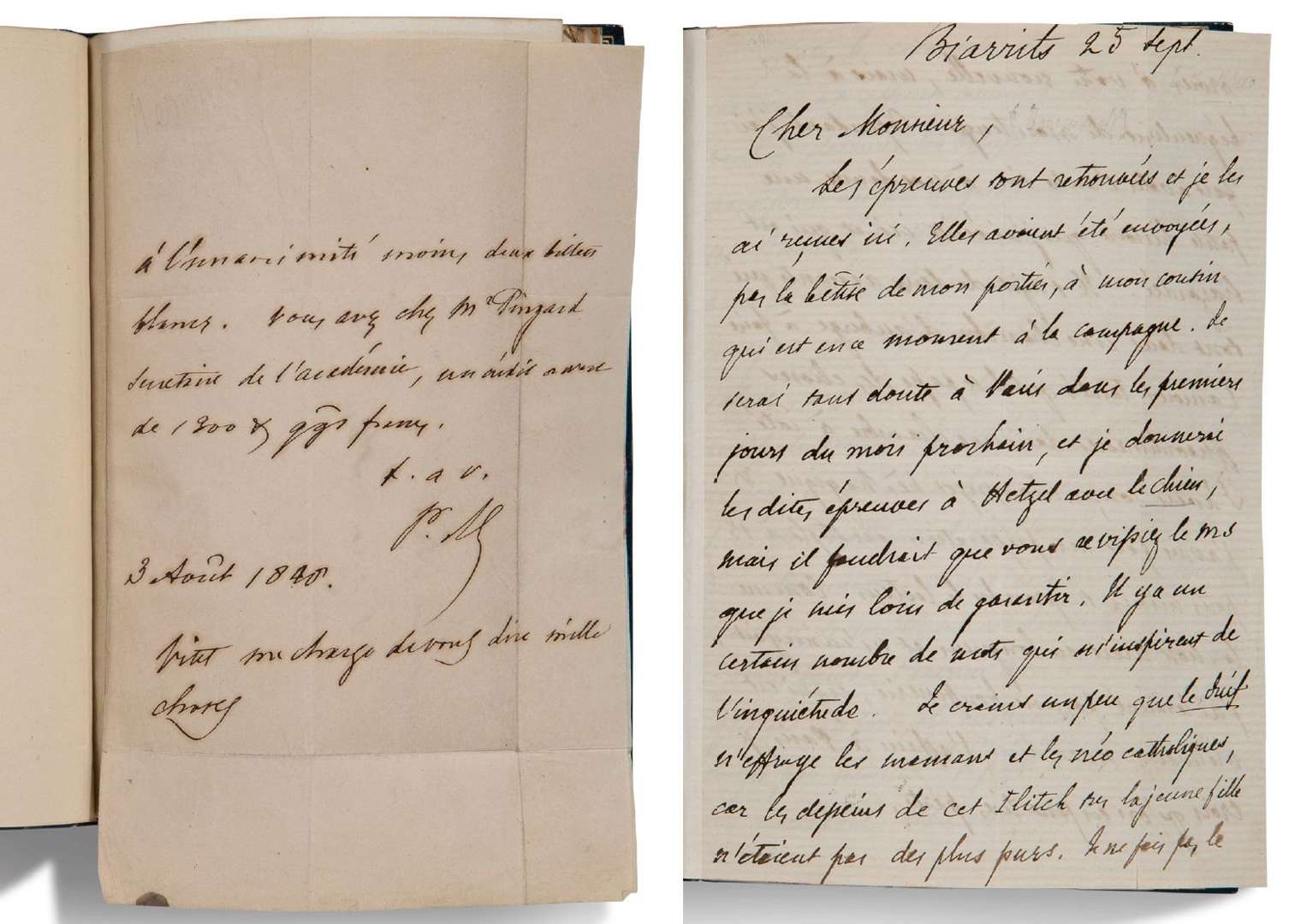 - une longue L.A.S. de Mérimée à Ivan TOURGUENIEV (Biarritz 25 septembre [1866], 4 p. in-8), au sujet de ses traductions de contes de Tourgueniev, Le Chien et Le Juif, craignant que ce dernier «n'effraye les mamans et les néo catholiques» | puis il évoque La Chambre bleue : «j'ai fait avaler l'autre soir à nos dames une petite histoire que j'ai écrite ici et qui est hazardée. Il s'agit de deux amants qui sont dans une chambre d'auberge à faire l'amour tandis qu'il se passe des choses extraordinaires dans une chambre à côté. J'avais conçu mon sujet très tragique [...] Comme la chose tirait en longueur et m'ennuyait, j'ai terminé par une bouffonnerie, ce qui est mauvais»...