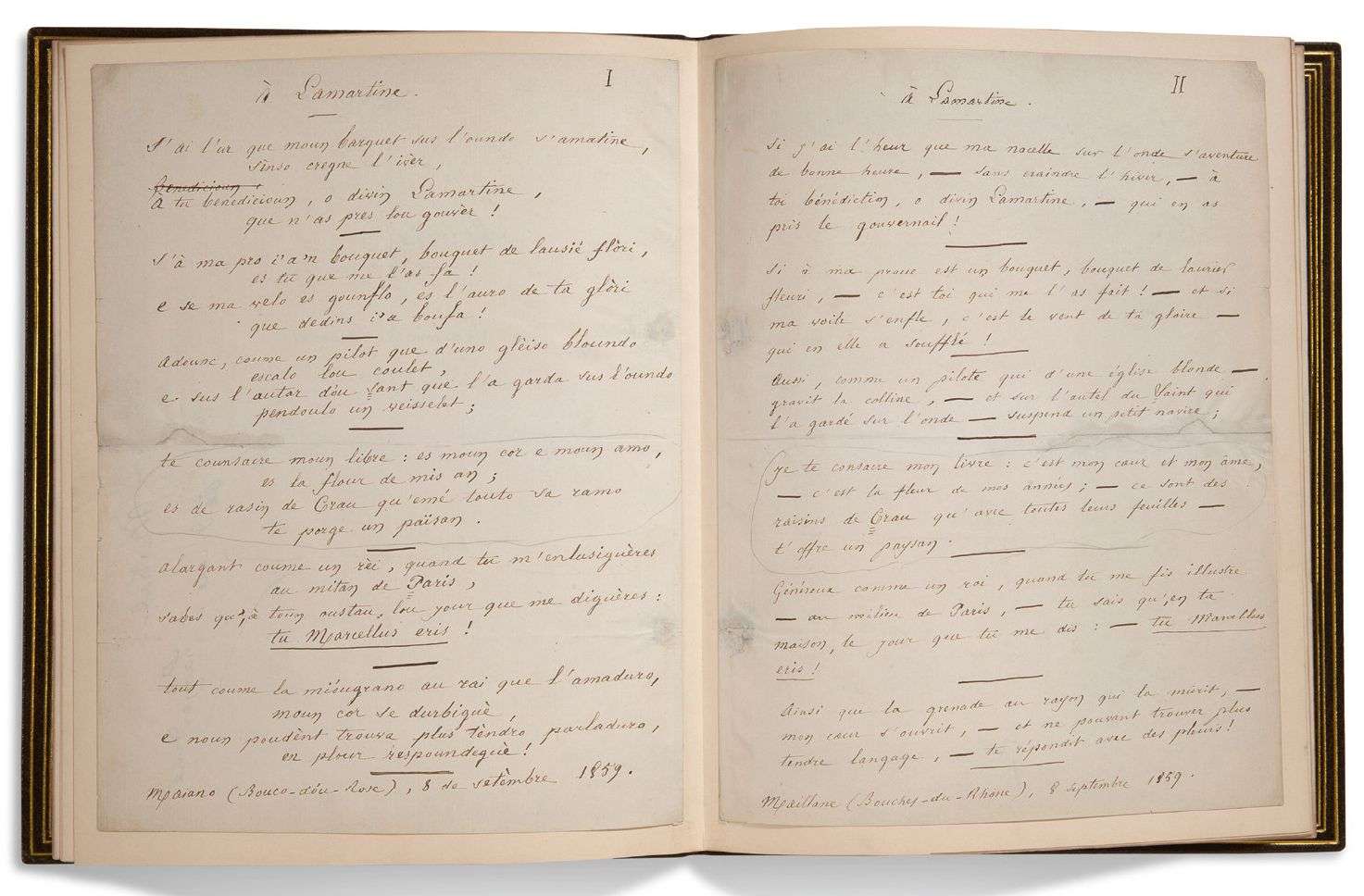 POÈME autographe, À Lamartine, en provençal et en français, Maillane 8 septembre 1859 | 2 pages in-4 (fentes réparées), montées sur onglets, reliure maroquin olive, cadre intérieure de filets dorés (Canape et Corriez, 1930).