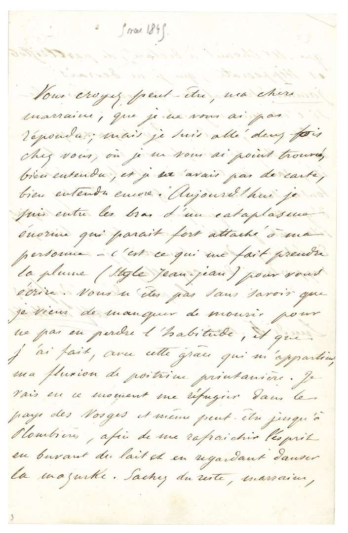 Aujourd'hui je suis entre les bras d'un cataplasme énorme qui paraît fort attaché à ma personne - c'est ce qui me fait prendre la plume (style Jean-Jean) pour vous écrire. Vous n'êtes pas sans savoir que je viens de manquer de mourir pour ne pas en perdre l'habitude, et que j'ai fait, avec cette grâce qui m'appartient, ma fluxion de poitrine printanière. Je vais en ce moment me réfugier dans le pays des Vosges et même peut-être jusqu'à Plombières, afin de me rafraîchir l'esprit en buvant du lait et en regardant danser la mazurke. Sachez du reste, marraine, que Mr Chomel a déclaré, de par Aristote et Hippocrate, que je ne devrais jamais être malade. Je vous demande si c'est encourageant»... Il suppose qu'elle va courir cet été, sans doute revoir Marly, etc. «Tâchez d'y retrouver quelques-uns de mes soupirs, s'ils ont poussé dans ces beaux lieux.