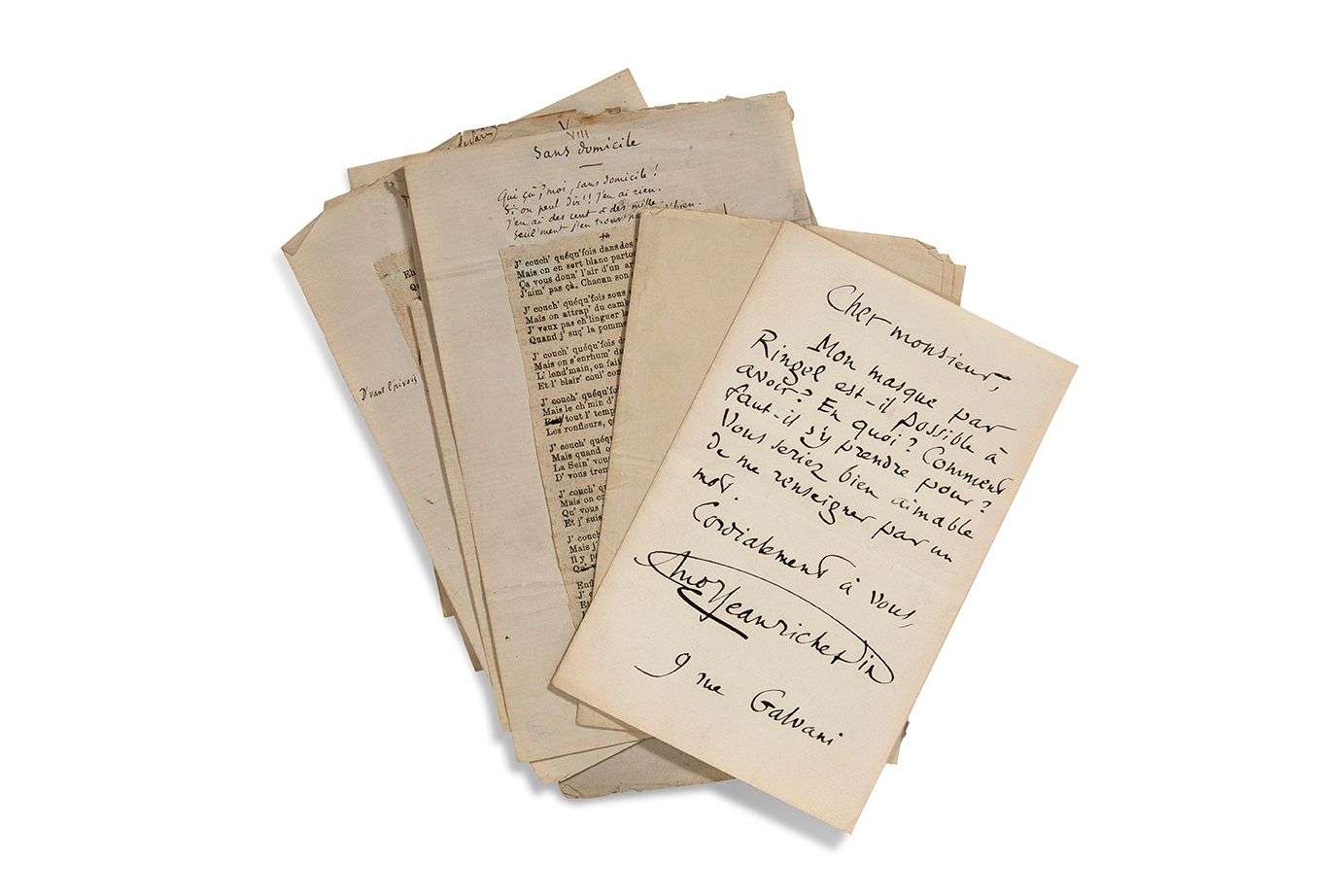 Épreuves corrigées pour une nouvelle édition de La Chanson des Gueux, avec de nombreuses corrections et additions autographes (notamment une strophe ajoutée à Sans domicile et à Vieux poivrot), et deux poèmes autographes complets : Le Marchand de coco et Un coup d'bleu