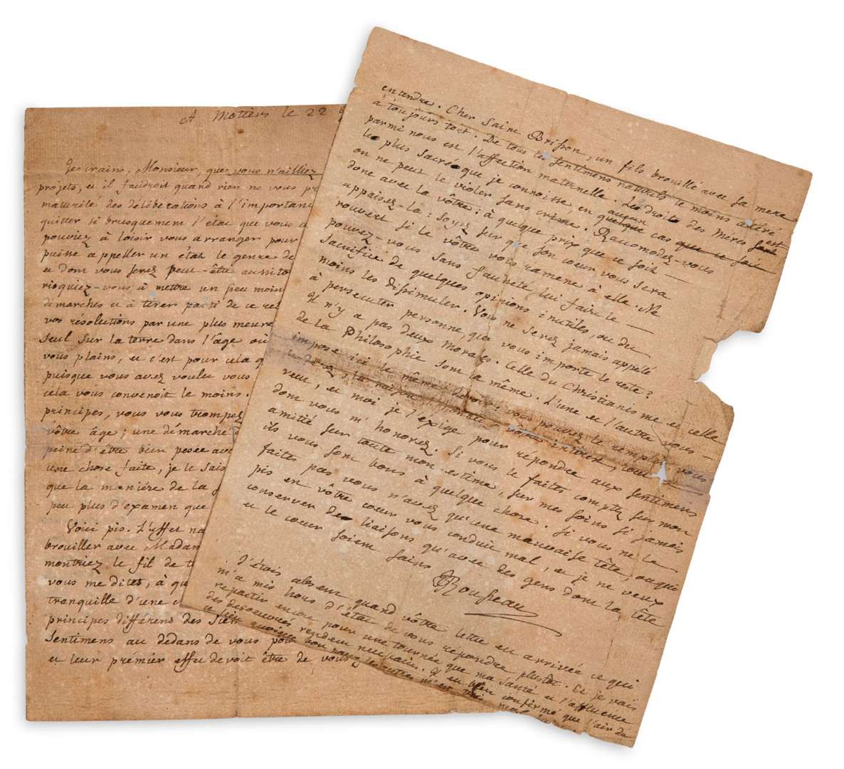 L.A.S. «JJRousseau», Motiers 22 juillet 1764, à Sidoine SÉGUIER de SAINT-BRISSON | 3 pages in-4, adresse avec cachet de cire rouge (sceau écrasé | papier bruni, lettre fendue aux plis, trace de réparation au scotch).