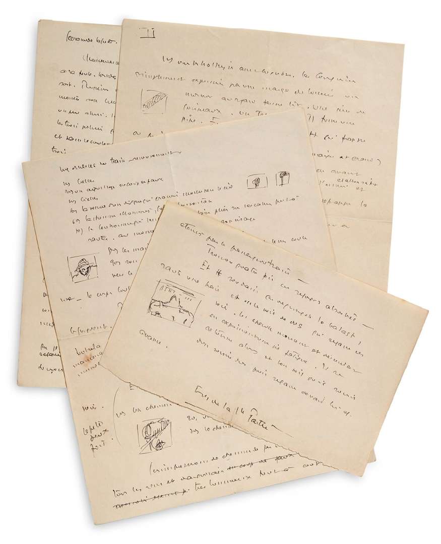 MANUSCRIT autographe avec 7 petits DESSINS à la plume pour un scénario de film | 3 pages et demie in-4.