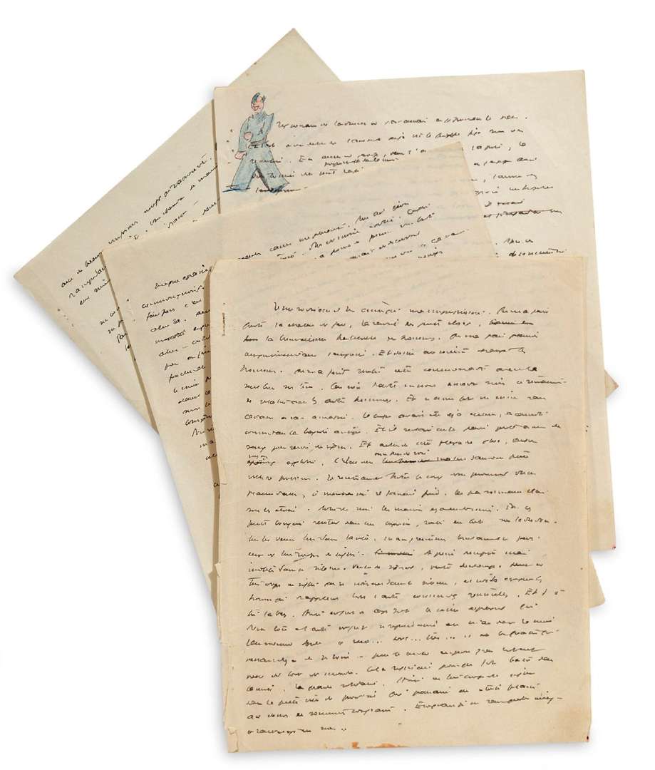 MANUSCRIT autographe avec DESSIN | 4 pages in-4 remplies d'une petite écriture serrée (trace marginale d'agrafage).