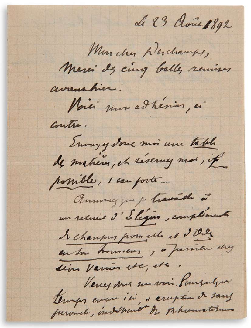 L.A.S. «Paul Verlaine», 23 août 1892, à Léon DESCHAMPS | 3 pages in-12.