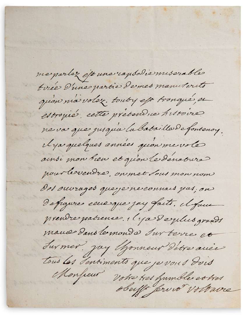 Il est doublement flatté : «les vers que vous daignez m'adresser sont les meilleurs que j'aye jamais vus de vous. Vous voyez que ce sont les obstacles qui font les succès, et que c'est souvent d'un terrain ingrat qu'on tire le meilleur parti». Il aurait aimé les entendre de sa bouche, mais sa «déplorable santé» l'en a empêché | mais le conseiller le Bault le «mettra peutetre en etat de faire le voiage s'il continue a me faire avoir un aussi bon cordial que son vin»... «L'Histoire de la guerre de 1741 dont vous me parlez est une rapsodie miserable tirée d'une partie de mes manuscrits qu'on m'a volez. Tout y est tronqué, et estropié. Cette prétendue histoire ne va que jusqu'à la bataille de Fontenoy. Il y a quelques années qu'on me vole ainsi mon bien et qu'on le dénature pour le vendre. On met sous mon nom des ouvrages que je ne connais pas | on defigure ceux que jay faits. Il faut prendre patience. Il y a de plus grands maux dans le monde sur terre et sur mer»...