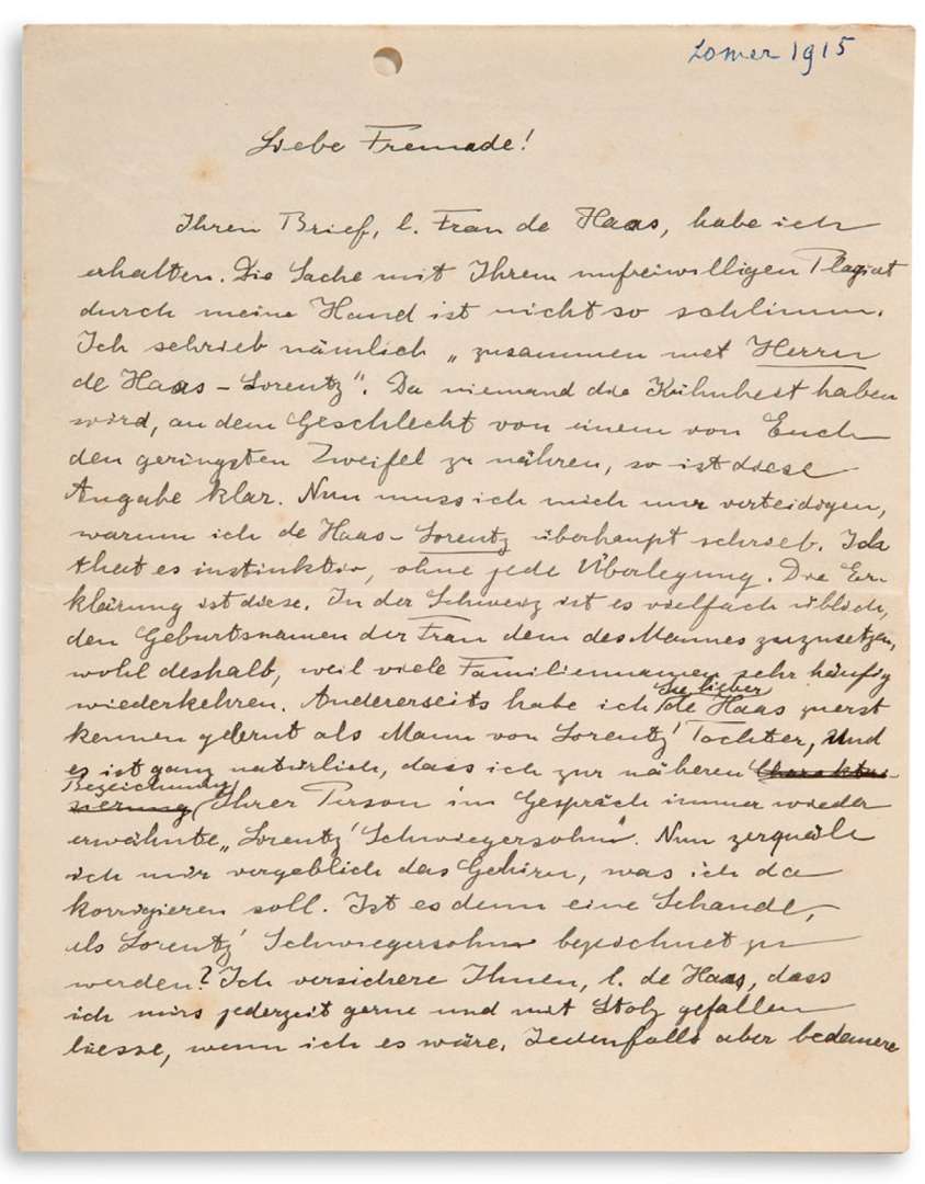 L.A., [vers le 10 mai 1915], à ses amis Wander Johannes DE HAAS et sa femme Geertruida | 3 pages petit in-4 (signature découpée, 2 trous de classeur) | en allemand.