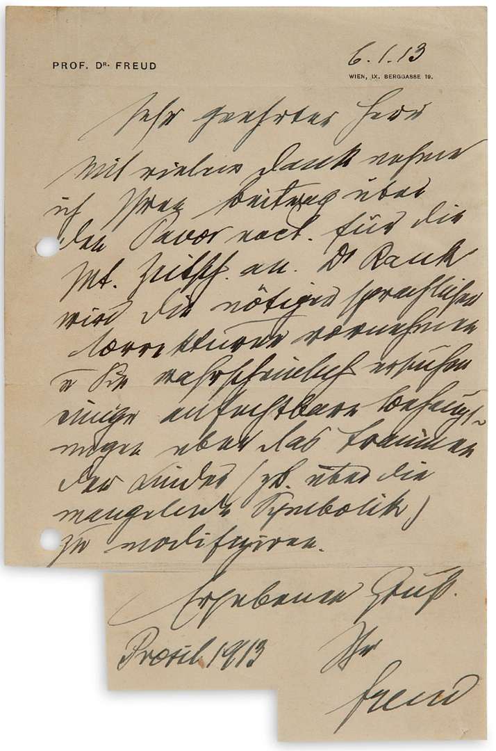 L.A.S. «Freud», Wien 6 janvier 1913, [à Frits van RAALTE] | 1 page in-8 à son en-tête Prof. Dr Freud et son adresse Wien, IX, Berggasse 19 (trous de classeur | le bas de la lettre avait été découpé et a été recollé, mais manque le coin inférieur gauche, sans perte de texte) | en allemand