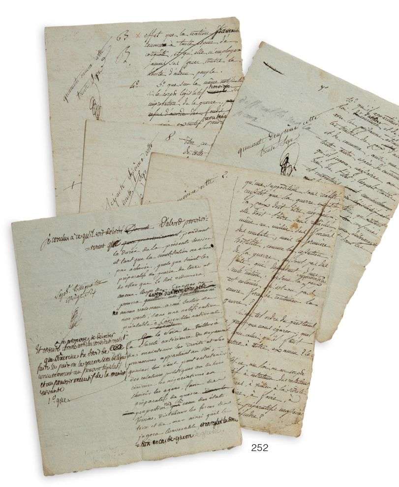 Fragments des interventions de Mirabeau dans la discussion de la question constitutionnelle de savoir si la Nation doit déléguer au Roi l'exercice du droit de la paix et de la guerre. Un important fragment de 12 pages (sur 3 feuillets doubles, numérotés 2, 8 et la conclusion), signé et daté du 18 mai 1790, provient du brouillon de son discours prononcé le 20 mai 1790 à l'Assemblée Nationale, dicté à deux secrétaires différents, et fortement corrigé par Mirabeau | trois pages sont le brouillon du projet de décret présenté le 22 mai, après un nouveau discours. Les textes ont été recueillis dans les Œuvres de Mirabeau.