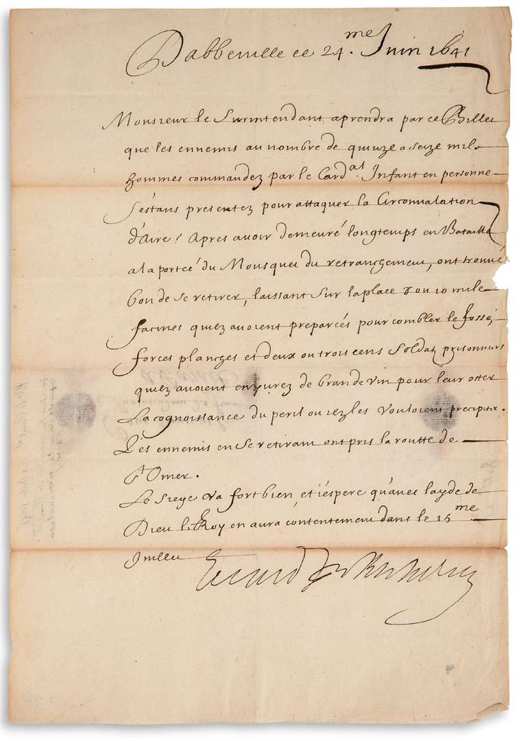 Il lui apprend que «les ennemis au nombre de quinze a seize mile hommes commandez par le Cardal Infant en personne s'estans presentez pour attaquer la circonvalation d'Aire, apres avoir demeuré longtemps en bataille a la portée du mousquet du retranchement, ont trouvé bon de se retirer, laissant sur la place 8 ou 10 mile facines quilz avoient preparées pour combler le fossé, forces planches et deux ou trois cens soldatz prisonniers quilz avoient enyvrez de bran de vin pour leur oster la cognoissance du peril ou ilz les vouloient precipiter. Les ennemis en se retirant ont pris la routte de St Omer. Le siege va fort bien, et j'espere qu'avec layde de Dieu le Roy en aura contentement dans le 15me juillet»