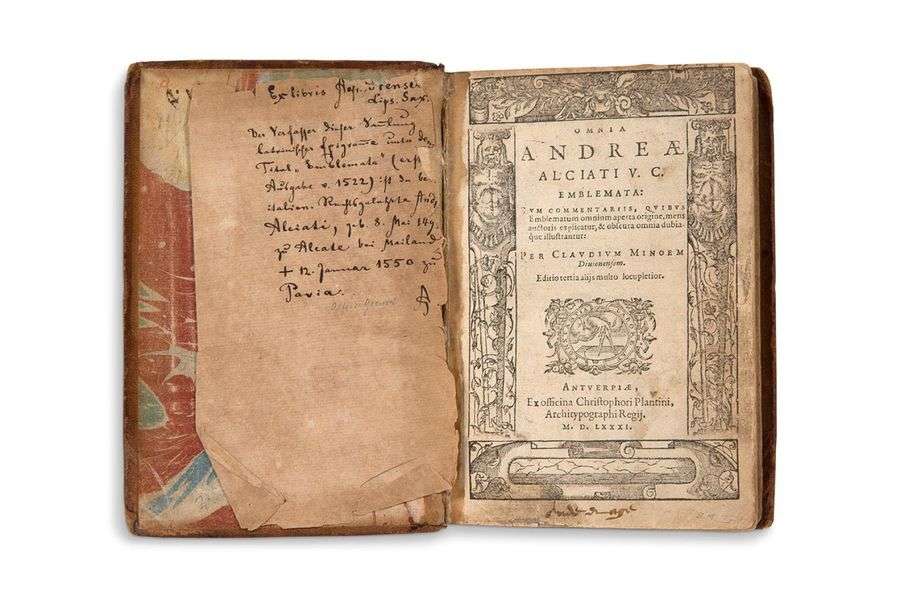 Nouvelle édition augmentée (l'édition originale avait paru en 1531), la troisième chez Plantin avec le commentaire de Claude Mignault. Ornée de d'un titre-frontispice gravé et de 211 figures gravées sur bois, dans le texte.