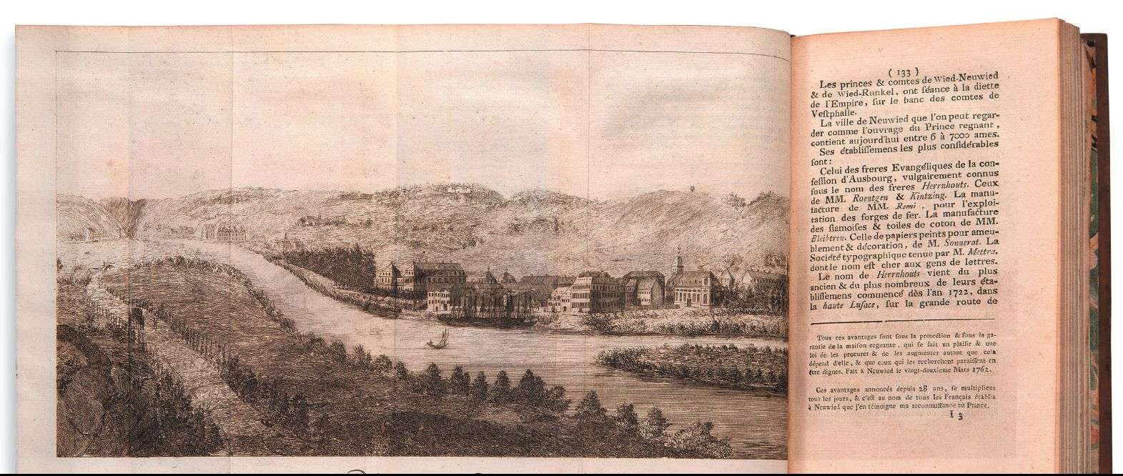 Édition originale de la traduction française de cet ouvrage issu de la première imprimerie établie à Neuwied. Illustrée de 10 planches dépliantes figurant 1 carte, des vues (Mayence, Coblence, Neuwied), l'hôtel de la Grande prévôté de Mayence, etc.