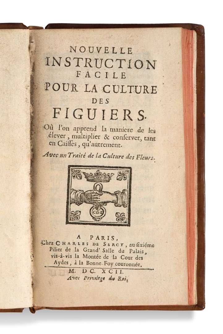 Édition originale très rare d'un des premiers traités consacrés à la culture du figuier, composé par Gilles Loistron, sieur de Ballon (1634-1693), directeur des plants d'arbres à Versailles, et Garnier, jardinier du Roi. L'ouvrage est suivi d'un Traité de la culture des fleurs que l'on attribue parfois à Pierre Morin.