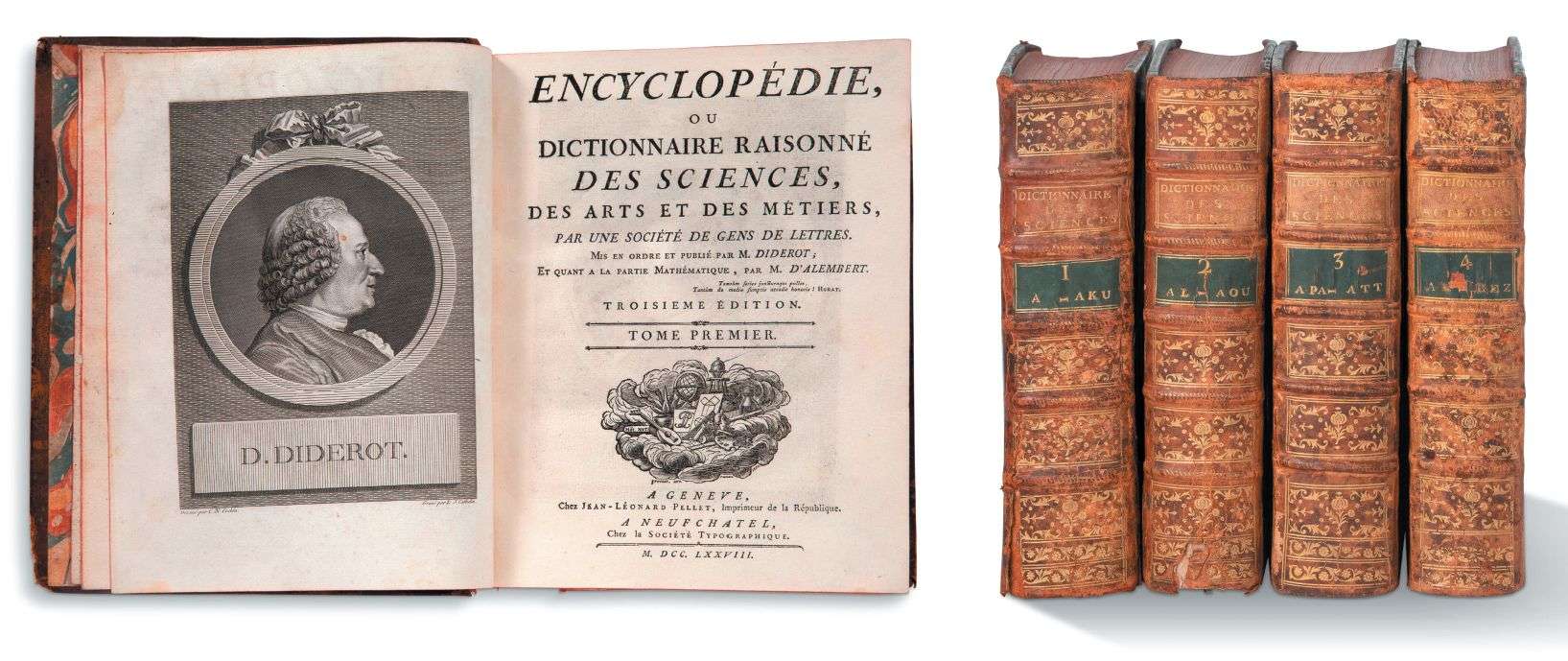 Genève, Jean-Léonard Pellet | Neufchâtel, la Société typographique, 1778-1779. 36 volumes de texte in-4 (261 x 210 mm) et 3 volumes de planches in-4. Plein veau marbré, dos à nerfs orné de fleurons dorés, pièces de titre de maroquin blond, pièces de tomaison de maroquin vert, tranches rouges, filets dorés sur les coupes, gardes de papier marbré (reliures d'époque).