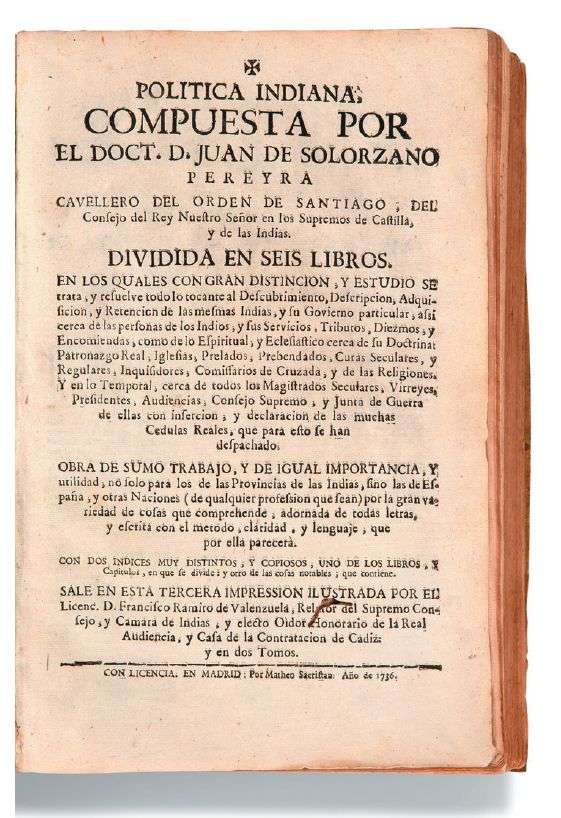 Premier volume de la troisième édition de cet ouvrage comportant les 3 premiers livres. Érudit et juriste, Juan de Solorzano y Pereyra fut envoyé par le roi Felipe III à la vice-royauté du Pérou. Il devient dès lors la grande figure du droit indien au XVIIe siècle.