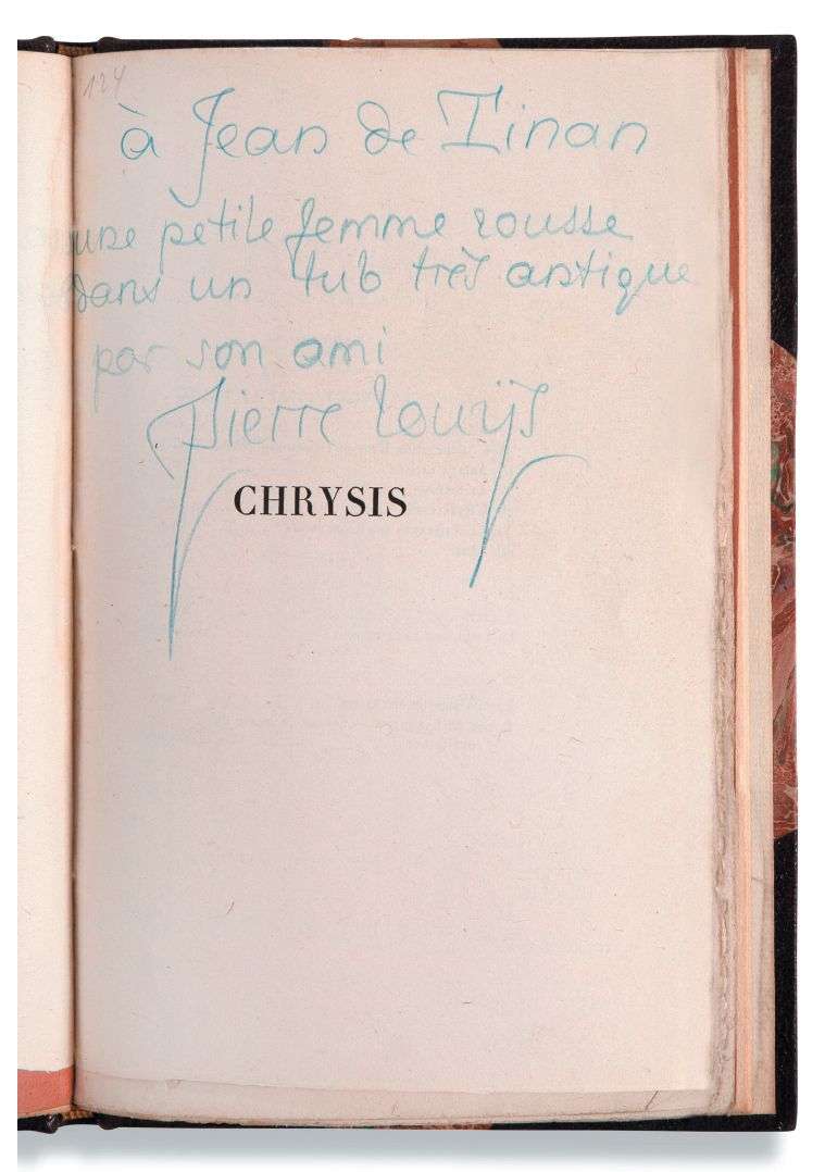Exemplaire offert par l'auteur au romancier Jean de Tinan (1874-1898), à qui l'ouvrage est dédié, avec cet envoi autographe signé au crayon bleu : «à Jean de Tinan une petite femme rousse dans un tub très antique par son ami Pierre Louÿs».