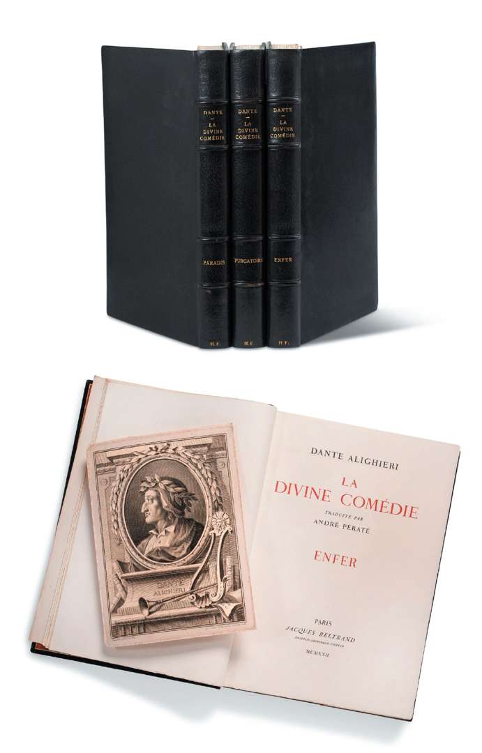 Édition bilingue traduite par André Pératé, publiée à l'occasion du sixième centenaire de la mort de Dante, et illustrée d'environ 150 gravures sur bois en camaïeu dans le texte d'après Botticelli, par Georges, Camille et Jacques Beltrand.