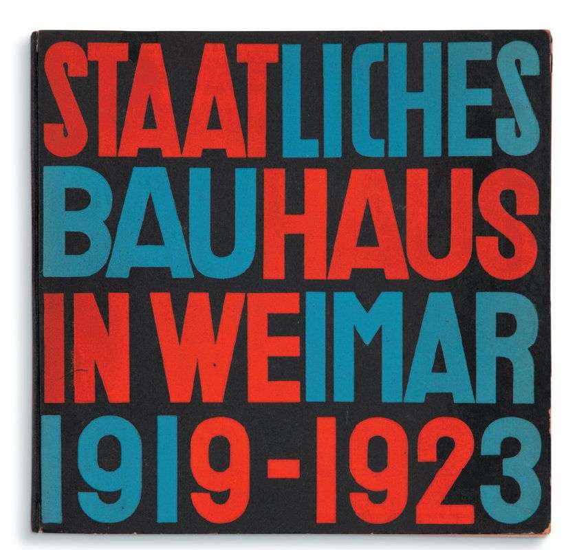 Typographie du titre conçu en rouge et bleu par H. Bayer, avec des textes de Gropius, Kandinsky, Klee, Moholy-Nagy.