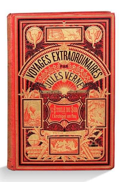 L'Étoile du sud (le Pays des diamants).-L'Archipel en feu. Paris, Bibliothèque d'éducation et de récréation, J. Hetzel et Cie, s.d. Grand in-8, percaline rouge, grand décor doré et à froid, dos lisse, tranches dorées (A. Souze-Lenègre).