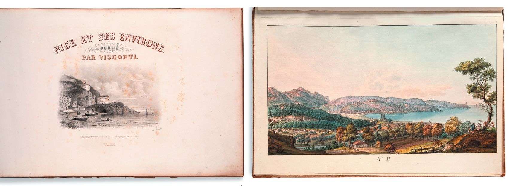 L'on joint : [NICE]. VISCONTI, Nice et ses environs. Paris. Visconti, s.d. [circa 1850]. In-folio oblong, cartonnage d'éditeur imprimé et illustré. Édition illustrée de 13 dessins d'après nature de F. Cockx, lithographiés en deux teintes par Daniaud, dont un sur le titre, répété sur le cartonnage.