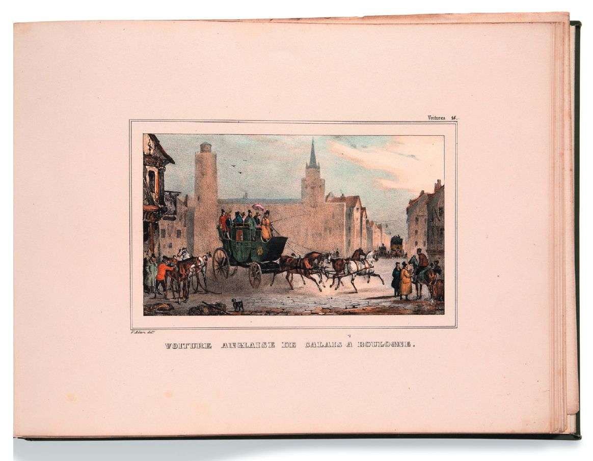 Rare album composé de la série complète des trois livraisons comportant en tout 36 lithographies par Charles Motte avec son timbre à froid (sur certaines planches), d'après Victor Adam : landau, coucous, tilbury, etc.
