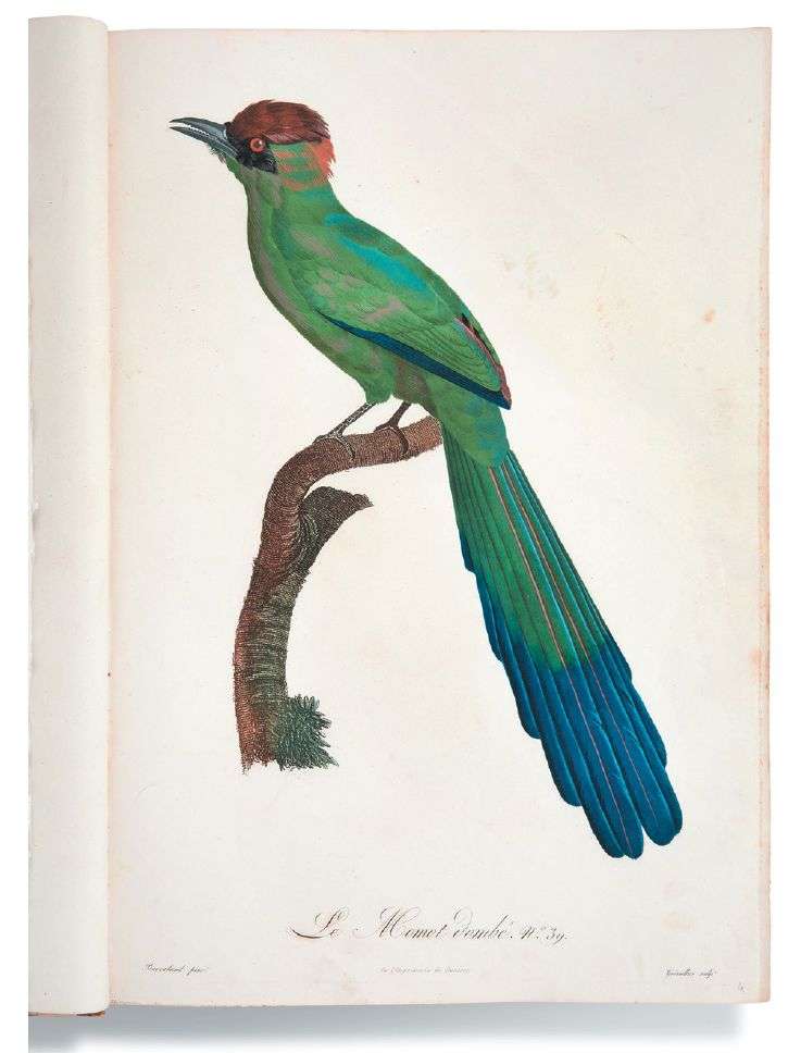 Belles épreuves, probablement des épreuves d'essai avant la lettre imprimées en noir, à l'exception de deux planches imprimées en couleurs («Momot dombé. N°39», épreuve avec la lettre et «Pie de paradis ou l'incomparable mâle», épreuve avant la lettre, planche pliée). La plus grande partie des planches sont titrées et numérotées au crayon.