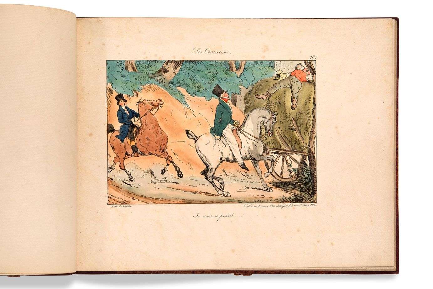 Les Contretems [en caricatures] [Paris], Gide fils, 1823-1824. Album petit in-4 oblong (215 x 282 mm), 24 pl. Demi-maroquin rouge à coins, filets dorés en encadrement du cartonnage, dos lisse titré et orné de fleurons dorés dans caissons, gardes de papier marbré (monogramme «ECB» en haut à gauche) (V. Champs).