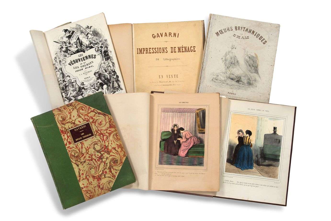 - Album comique par Gavarni. Paris, Au bureau du journal amusant et du Petit journal pour rire, s.d. Broché in-4, 30 planches lithographiées en couleurs, légendées et numérotées pour Les Lorettes.