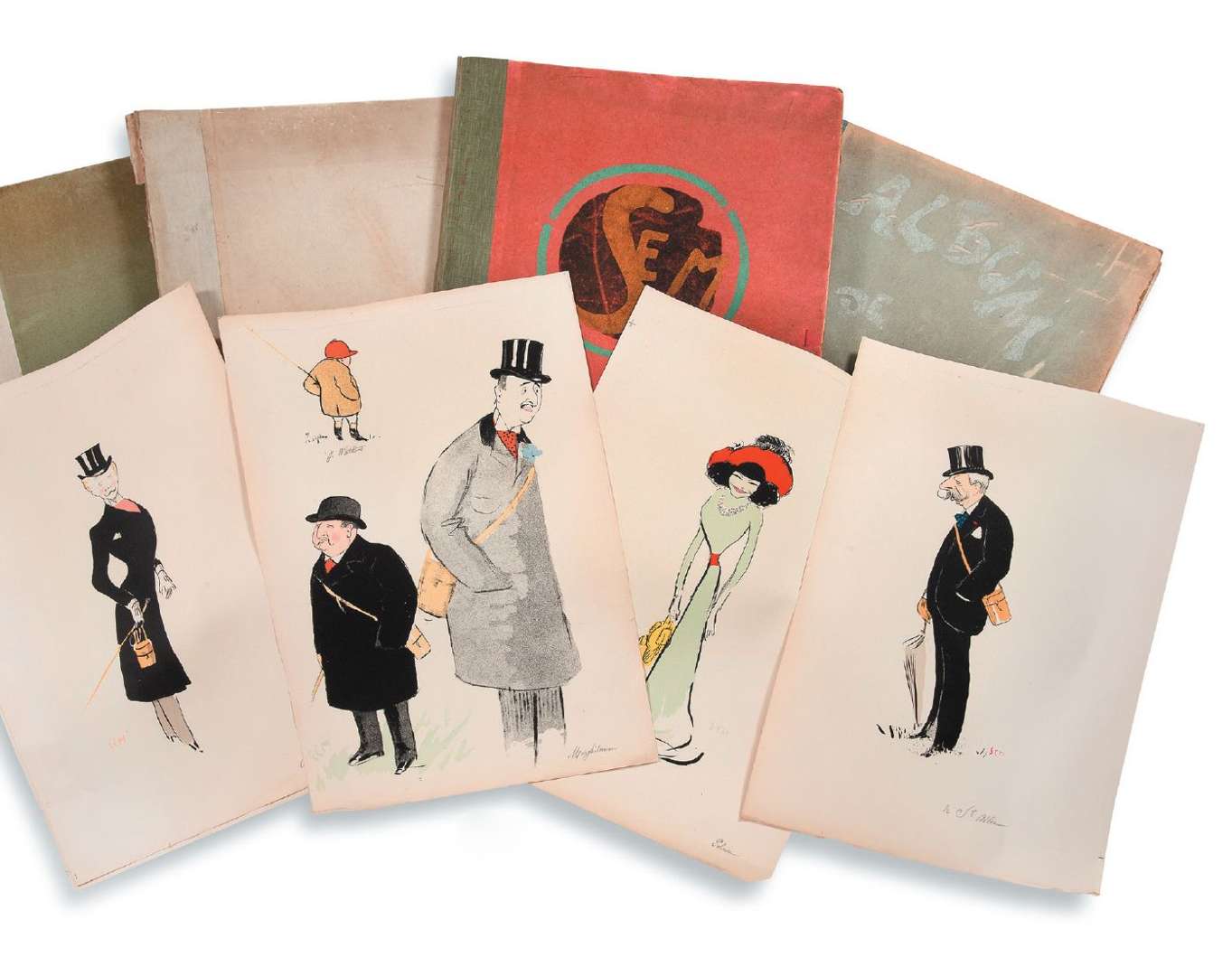 Ensemble d'albums portfolio contenant des planches préparatoires colorisées ou rehaussées de blanc, présentant pour certaines des annotations manuscrites d'édition, et des tirages appartenant à plusieurs albums, dont :