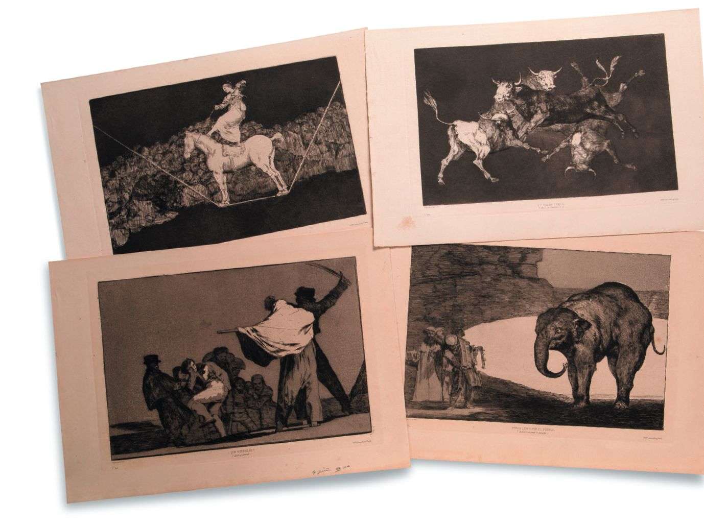 Suite complète des quatre rares planches surnuméraires destinées à la série «Les proverbes», d'un tirage posthume publié pour la première fois par la revue l'Art en 1877.