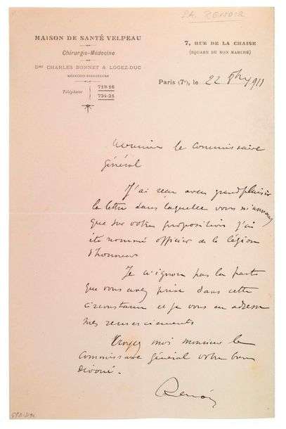 Lettre de Renoir à la Maison de santé Velpeau où le peintre s'était rendu afin de soigner ses malformations aux mains qui le gênaient tant pour peindre. Il est heureux d'apprendre, du commissaire général d'une exposition, que sur votre proposition j'ai été nommé officier de la Légion d'Honneur. Je n'ignore pas la part que vous avez prise dans cette circonstance et je vous en adresse mes remerciements (...)