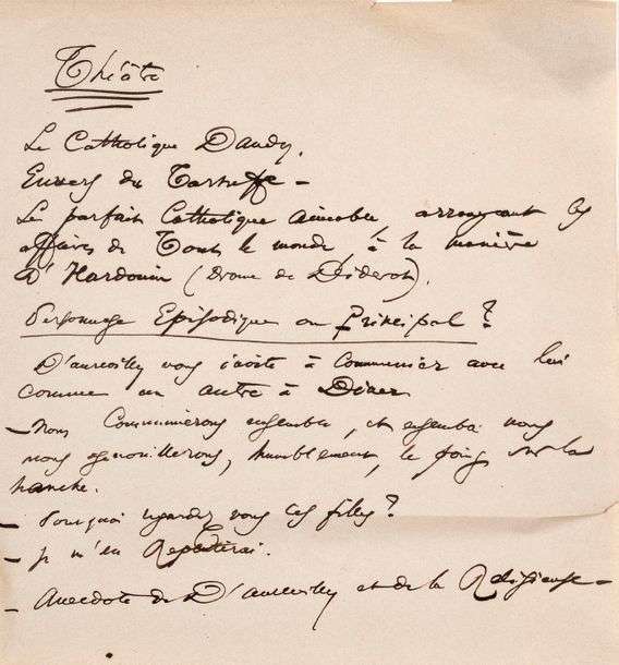 Note sur un projet théâtral où sont cités Diderot et Barbey d'Aurevilly, deux écrivains qui ont l'admiration de Baudelaire.