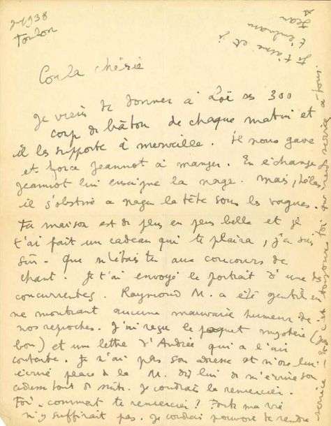 L.A.S. «Jean», Toulon juillet 1938, à la décoratrice Coula ROPPA| 1 page in-4.