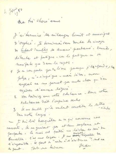 L.A.S. «Jean», 4 février 1950, [à son amie et traductrice Mary HOECK]| 1 page in-4.
