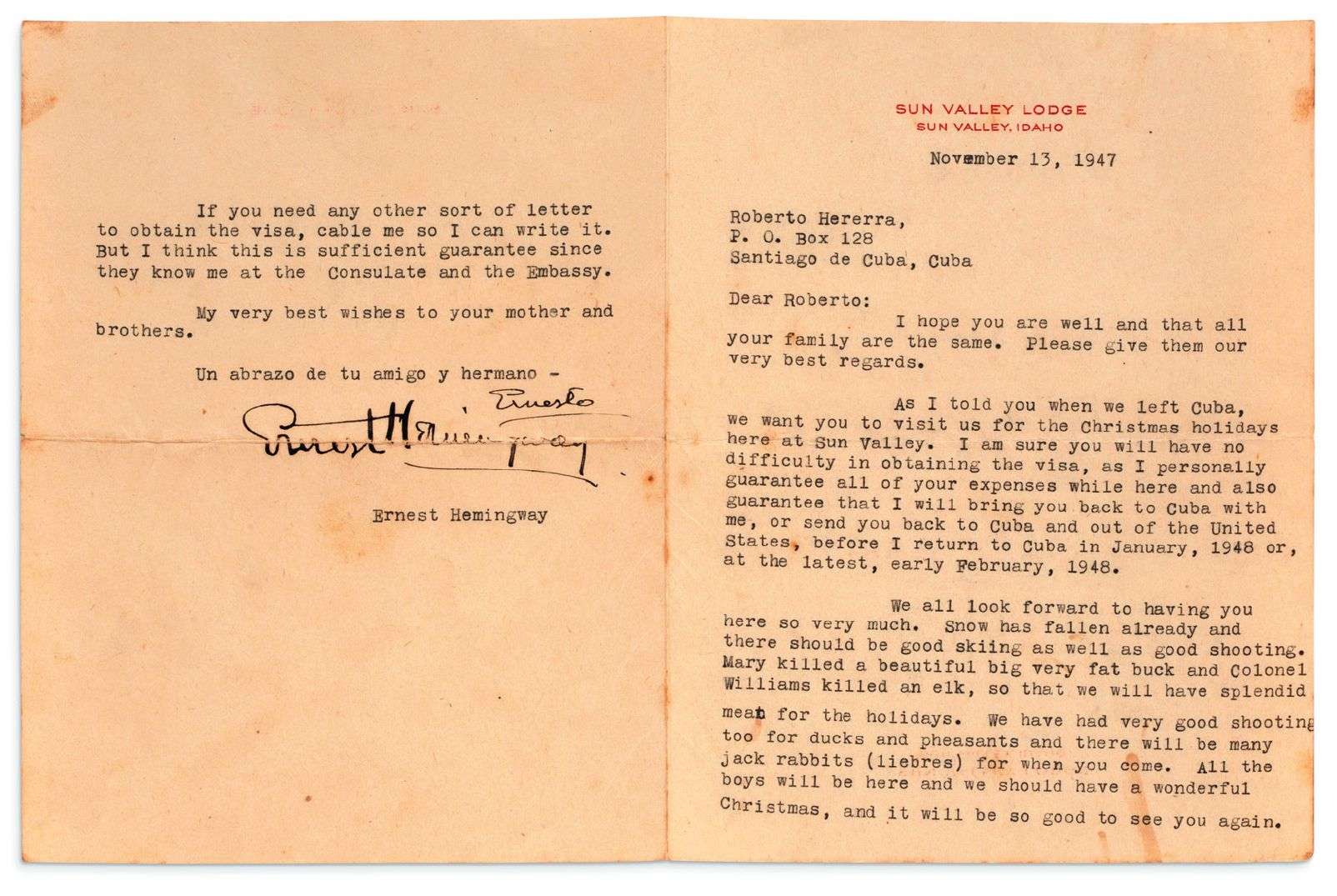 LETTRE TAPUSCRITE signée à Roberto HERERRA, Sun Valley, 13 novembre 1947 | 2 pages in-8 carrées, enveloppe conservée.