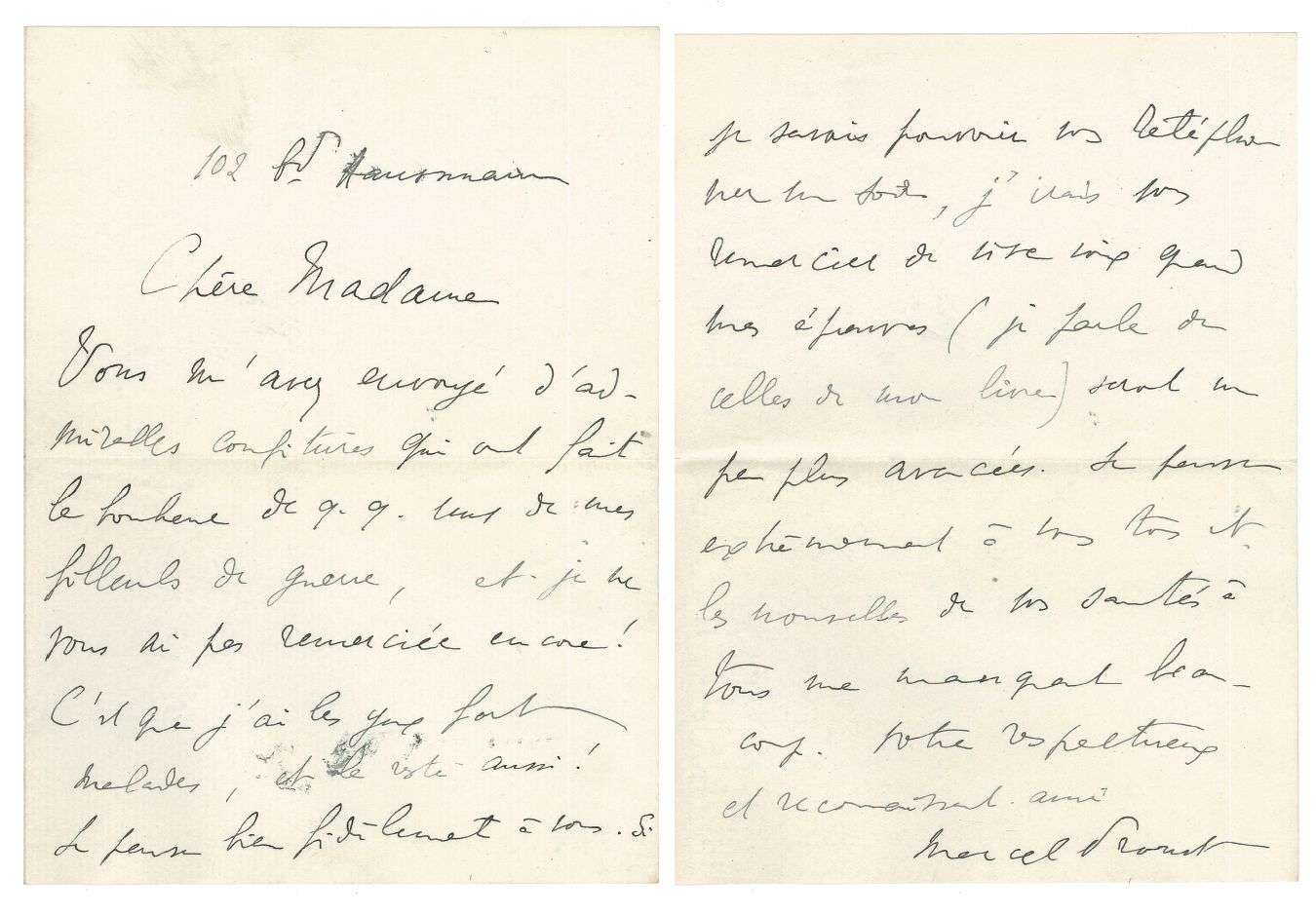 • L.A.S., 102 bd Haussmann [printemps ? 1918, à Mme Hugo FINALY, née Jenny Ellenberger ?] | 2 pages in-8.