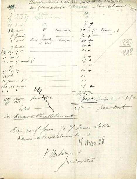 Parallèlement & [rayé: Poésies de Rimbaud à 125f chacun]»... Les 250 francs dus à l'auteur pour Amour et Parallèlement lui sont versés en 25 fois entre le 7 avril 1887 et le 27 mars 1888| les montants varient de 3,30 à 50 francs. Verlaine a signé la quittance du solde de ces deux titres.
