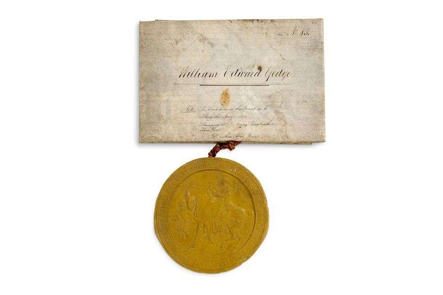 Deux parchemins liés par un grand sceau de cire jaune orné sur ses deux faces: l'une représentant la reine Victoria trônant entourée de deux allégories, et l'autre la représentant paradant à cheval avec le sceptre.