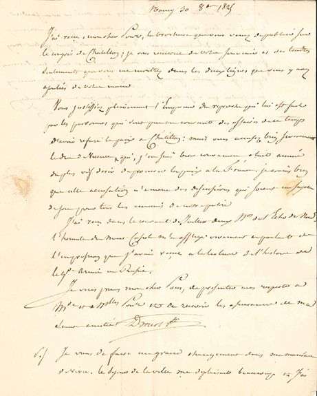9 juillet, il renvoie l'épreuve (jointe) de sa notice biographique, avec des corrections et suppressions à faire, dont un passage évoquant les ingrats et les félons. Lui-même a brûlé ses notes et matériaux «sur les grands évennemens qui ont précédés l'année 1816» : ils étaient incomplets et inexacts et il était incapable de s'élever à «la hauteur du sujet»... Ailleurs, il est question des procès et ennuis financiers de Pons, de visites du général Bertrand et d'Eusèbe Salverte, etc.