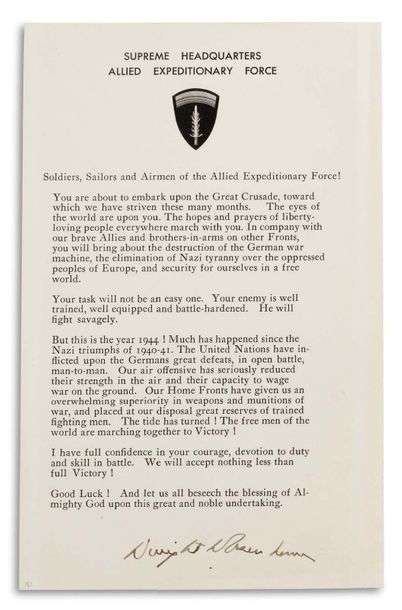 Eisenhower s’adresse aux soldats, marins et aviateurs des forces alliées. « Vous êtes sur le point de vous lancer dans la Grande Croisade, à laquelle nous avons tendu ces nombreux mois. Les yeux du monde sont sur vous. Les espoirs et les prières de personnes épris de liberté marchent partout avec vous. En compagnie de nos braves alliés et de nos frères d’armes sur d’autres fronts, vous provoquerez la destruction de la machine de guerre allemande, l’élimination de la tyrannie nazie sur les peuples opprimés d’Europe et la sécurité pour nous-mêmes dans un monde libre. Votre tâche ne sera pas facile. Votre ennemi est bien entraîné, bien équipé et endurci au combat. Il se battra sauvagement [...] J’ai toute confiance en votre courage, votre dévouement au devoir et votre habileté au combat. Nous n’accepterons qu’une victoire complète ! Bonne chance ! Et implorons la bénédiction de Dieu toutpuissant pour cette grande et noble entreprise »...