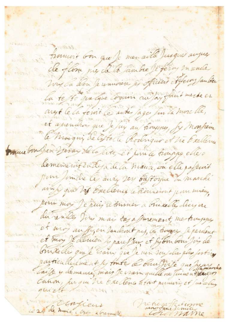 Longue lettre militaire de la fin de la Guerre de Trente Ans, alors que le duc combat avec les Impériaux dans les Pays-Bas espagnols, aux côtés de Piccolomini et de Castel-Rodrigo.