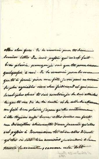 Tornau avec toi et ou elles disent qu'elles se sont bien amusées je voudrois bien pouvoir le connaître, comme cela doit t'interesser, si tu as besoin de quelque chose pour la petite ferme écris le moi je te l'enverrai. [...] Je pars pour Cherbourg après demain je voudrois que tu puisse voir la mer c'est un bien beau spectacle si j'en trouve des gravures je te les enverrai je laisse en attendant mon fils à St Cloud ou il se trouve à merveille je l'ai embrassée en ton nom»...