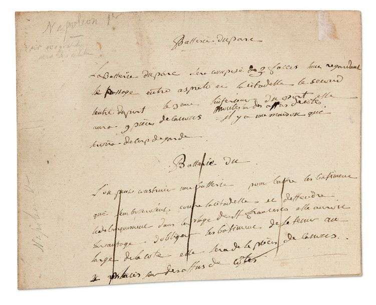 Ce manuscrit est lié au projet d'expédition sur la Corse, pour mettre l'île à l'abri d'une attaque anglaise. [Le 24 mars 1794, le Représentant du peuple Saliceti écrivait à Paris qu'il avait chargé le général Buonaparte de se rendre à Nice afin de tout préparer pour le succès de l'expédition de Corse.] «Batterie du Parc. La Batterie du Parc sera composée de 3 facces l'une regardant le passage entre Aspreto et la citadelle, le second l'entrée du port, le 3ème l'intérieur du port. Elle aura 9 pièces de canons montés sur des affus de côtes.Il y a une maison qui servira de corps de garde». «Batterie du L'on peut construire une batterie pour battre les batimens qui s'embosseroient contre la citadelle et deffendre le debarquement dans le village de St Francesco. Elle auroit l'avantage d'obliger les batimens de se tenir au large de la côte. Elle sera de 4 pièces de canons placés sur des affus de côtes». [Ce paragraphe a été biffé.] [Situées à côté de la maison natale de Napoléon Bonaparte à Ajaccio, les collines d'Aspretto dominent la rade. C'est à Aspretto que dans des conditions rocambolesques Napoléon vint recueillir sa mère fuyant les troupes de Paoli le 31 mai 1793.]