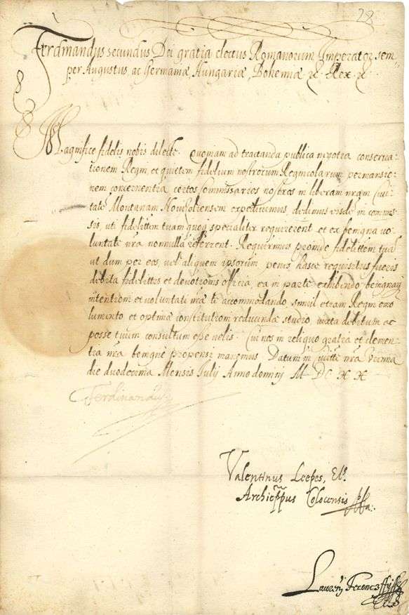L.S., Vienne 12 juillet 1620 | contresignée par Valentin LÉPES, archevêque de Kalocsa, et Laurent Ferenczy | 1 page in-fol., adresse avec grand sceau sous papier aux armes (signature pâlie) | en latin.