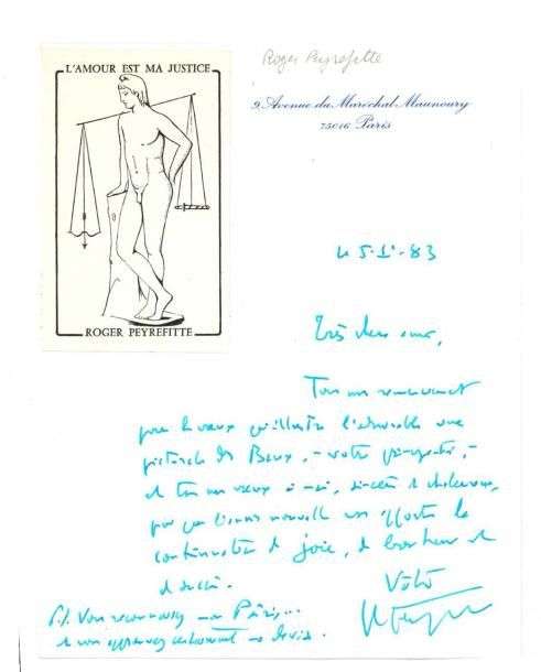 Correspondance au peintre Yves Brayer, dans laquelle Peyrefitte confie son attachement et son admiration pour son oeuvre. Votre art est un hommage à l'Amour. En 1981, Peyrefitte et Brayer collaborent ensembles à un projet d'ouvrage sur la Grèce. Voici mon texte pour vos magnifiques aquarelles. J'espère qu'il vous satisfera ainsi qu'à votre éditeur. Je vous confondrai désormais dans mon amour de la Grèce, puisque vous êtes, comme je le dis, son peintre idéal . / Enthousiasme et auprès du peintre. Mille fois merci, pour les deux ravissant dessins que vous m'avez envoyés. Je ne pouvais souhaiter rien de mieux : La Grèce et vous . Deux des lettres de Peyrefitte portent son ex-libris représentant Pâris surmontée de la devise : L'Amour est ma justice. Il fait cette observation : Vous avez reconnu dans le dessin de mon ex-libris ma statue de Pâris. Je crois vous en avoir déjà adressé un exemplaire. Mais rendre encore justice à l'Amitié, c'est rendre justice à l'Amour. Votre art est un hommage à l'Amour. Une leettre est adressé par l'écrivain à l'épouse de l'artiste qui est souffrant | On a peine à croire qu'un beau chêne comme lui, couronné de lauriers, ait pu subir le moindre ébranlement de sa solidité. J'aime à penser que ce trouble ne sera que passager et que vos soins, amoureux et fervents, remédieront autant que possible .JOINT une photo. représentant Roger Peyrefitte et Yves Brayer devant une statue antique. (Paris, mars 1982).