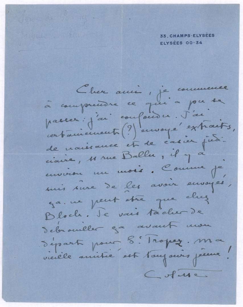 Amusante lettre où Colette essaye de 'débrouiller' une confusion qu'elle a du faire en envoyant un extrait de naissance et de casier judiciaire au mauvais destinataire, Bloch, 11 rue Ballu. Elle fait le nécessaire avant de partir pour St Tropez. Elle le salut en écrivant 'Ma vieille amitié est toujours jeune !'.